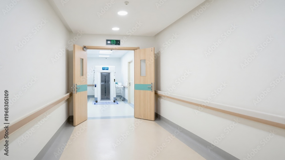 Open double doors at the end of a bright clinical hospital corridor sh. #1968305109