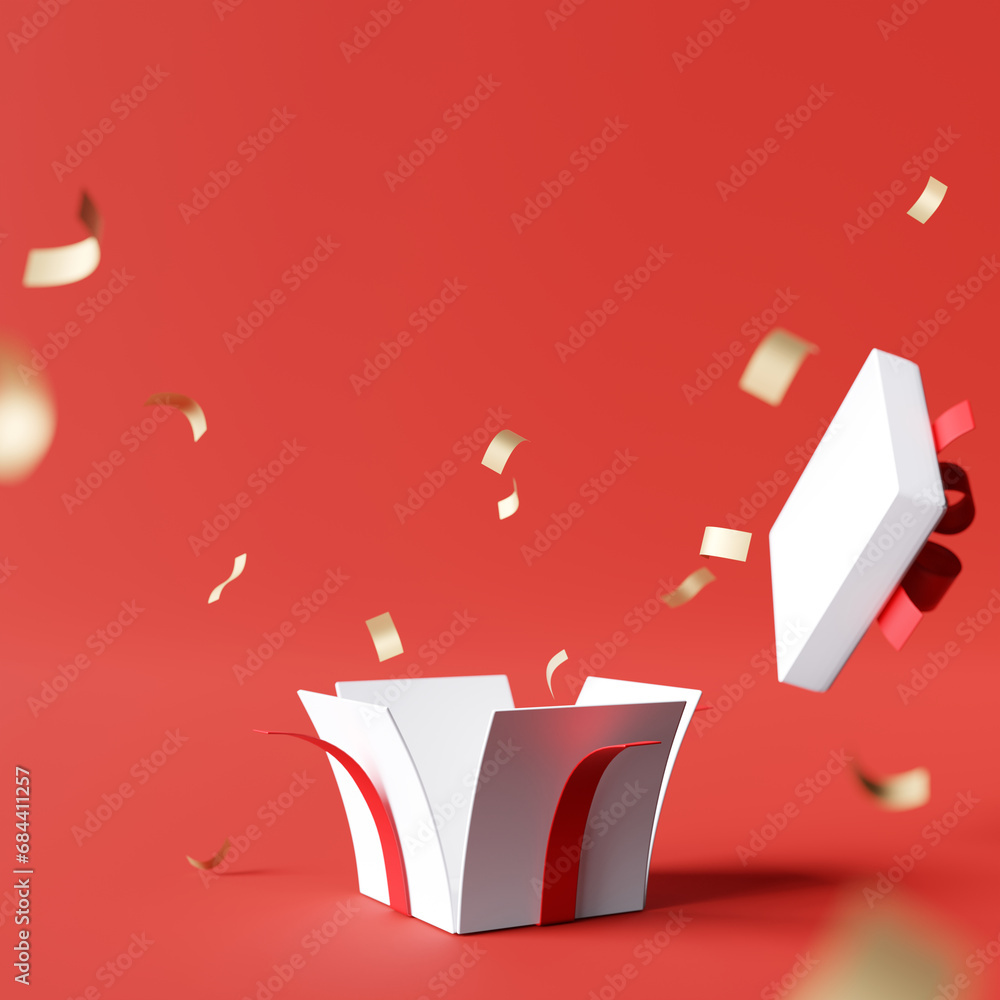 Open gift box with confetti on red background. 3d rendering #684411257