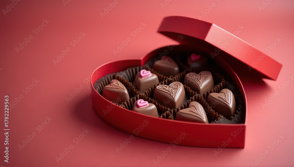 Open red heart-shaped box filled with decorated heart chocolates on a soft pink-red background, perfect for Valentine"s gifts. #1782229563