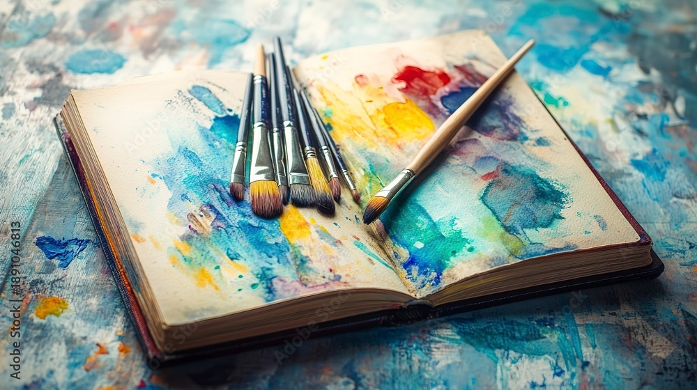 Open sketchbook with brushes and colorful paint on a wooden table in an art studio during daylight hours #1891046813