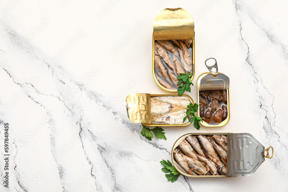 Opened tin cans with different fish and mussels on white marble table #597849455