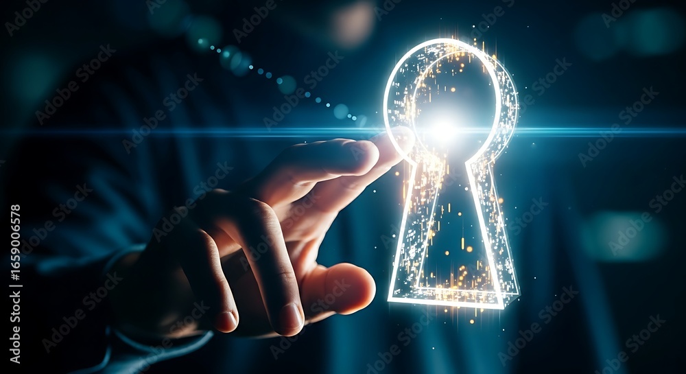Opportunity and discovery concept. A hand reaches towards a holographic keyhole emitting a bright light, symbolizing new opportunities or access. #1659006578
