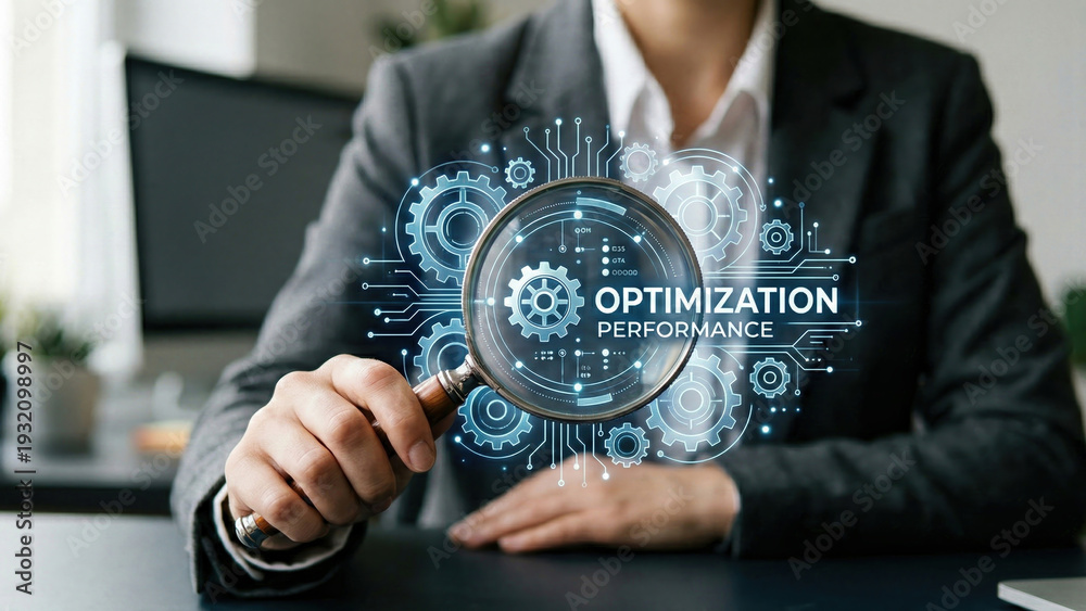 Optimization analytics platform predictive business optimization concept with magnifying glass over gears and performance focus #1932098997
