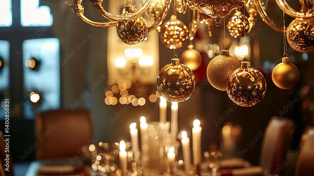 Opulent Christmas chandelier golden ornament hanging luxurious festive ambiance warm candlelit dining table elegant fine dining setting #1400858831