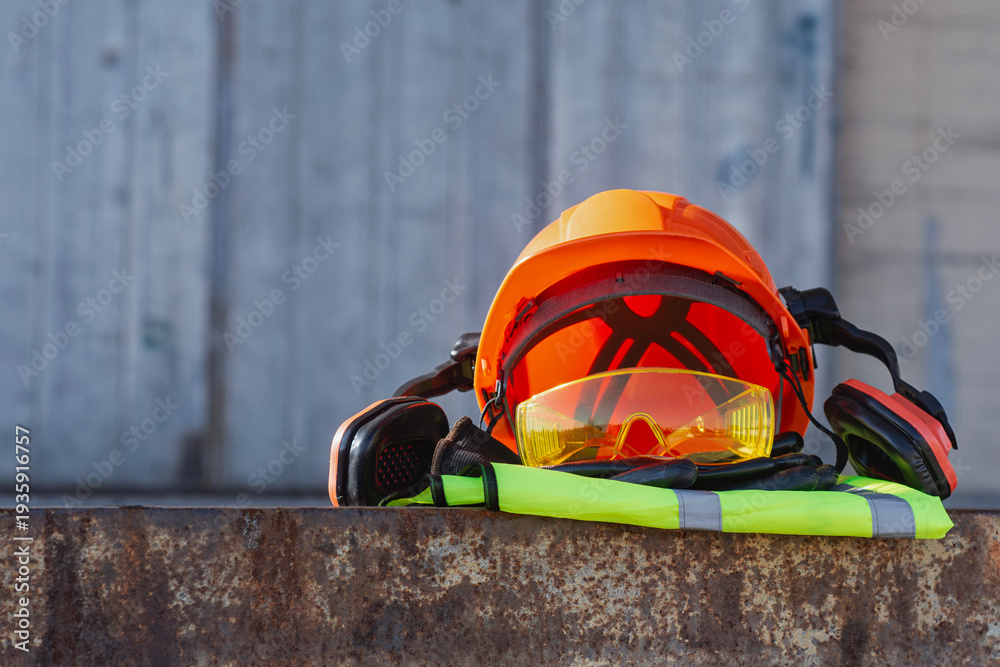 Orange hard hat with protective goggles, earmuffs and high visibility vest against industrial background. Personal protective equipment for construction workers and industrial safety. #1935916757