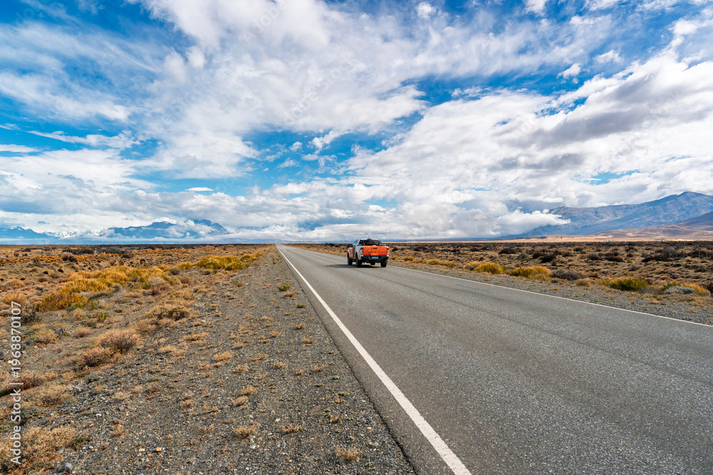 Orange pickup truck driving on a straight asphalt road through the vast wilderness of Patagonia, Argentina, with mountains and clouds in the background #1968870107