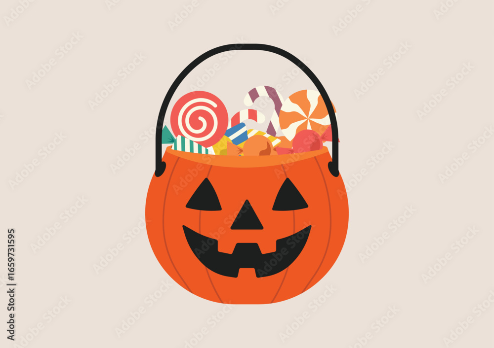 Orange pumpkin bucket filled with assorted candies and lollipops, jack o lantern face with black handle, symbol of trick or treat on Halloween celebration. Flat vector illustration #1659731595