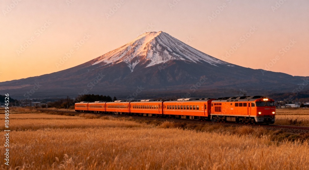 Orange Train Passing Mount Fuji at Sunset #1898594526