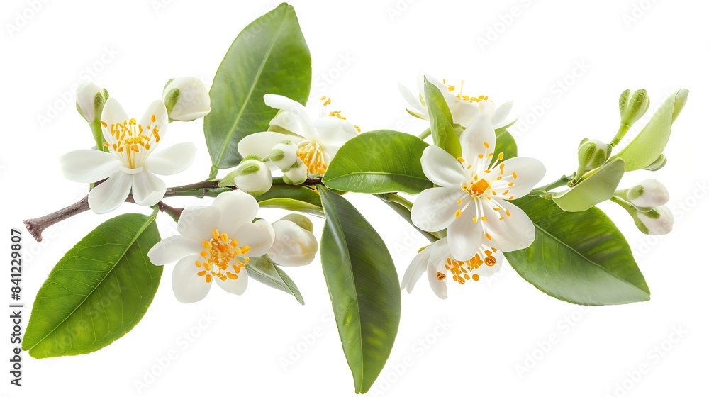 Orange tree branch with white flowers buds and leaves isolated on white Neroli blossom Citrus bloom : Generative AI #841229807