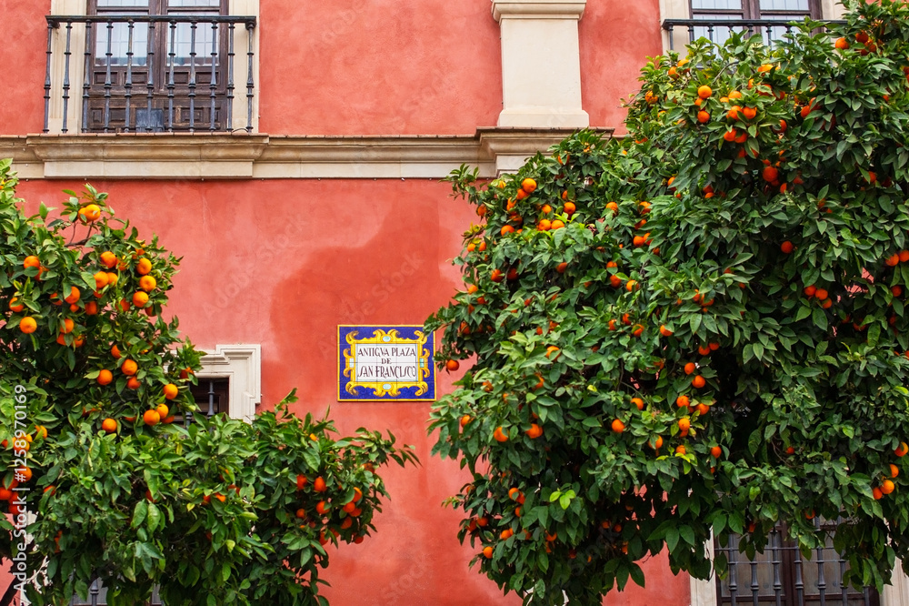 Orange Trees against a Red Wall in the old town of Seville, Andalusia, Spain #1258970169