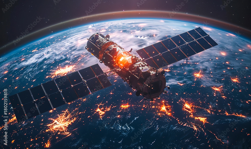 Orbiting Telecommunication Satellite with Holographic Earth, Futuristic Datum Technology for Internet Connection, GPS Services #1802159818