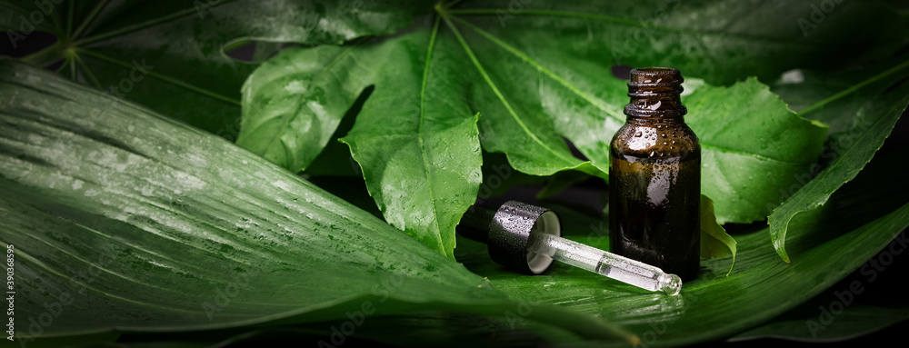 organic natural cosmetics. alternative medicine. essential oil bottle with dropper on wet green leaf background. banner #390368595