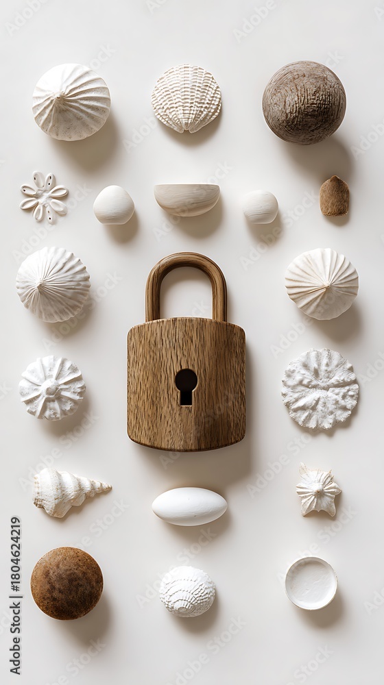 Organic wooden padlock among natural shapes and textures on white #1804624219