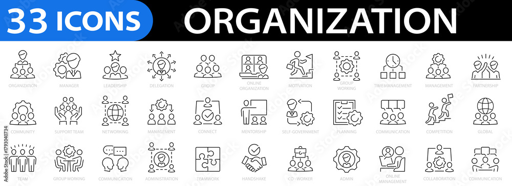 Organization line icon set. Manager icon collection. teamwork, structure, hierarchy, leadership, motivation, delegation, competition and more. Vector illustration #1793040734