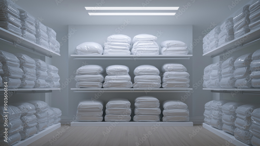 Organized linen closet filled with fresh, clean white bedding, pillows, and towels in protective plastic packaging, stacked neatly on shelves, ready for hospitality use #1903606164