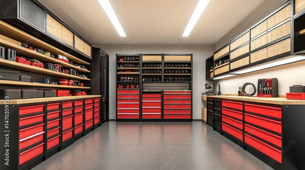 Organized, modern workshop with red and black cabinetry, ample storage, and a clean, bright interior #1470359753