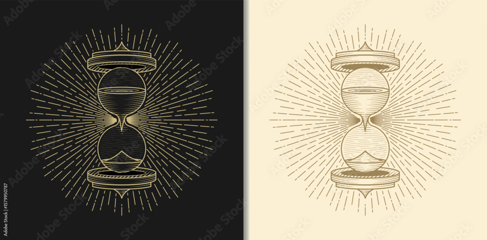 Ornamental hourglass illustration gold engraving on black and white background #1579950787