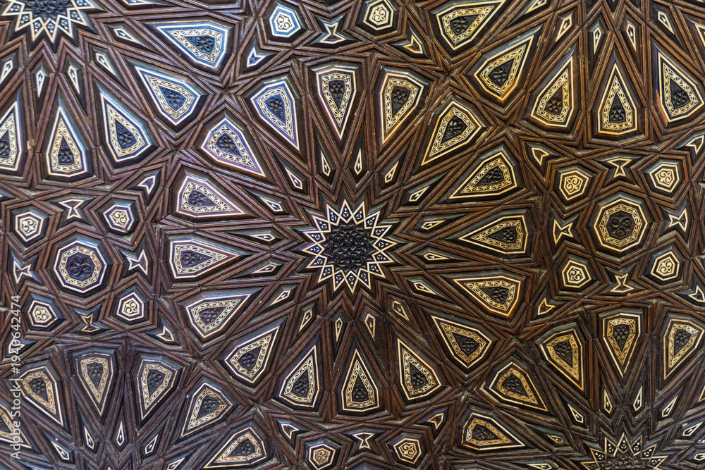 Ornate carved wood ceiling with geometric star pattern in historic Cairo, Egypt mosque architecture #1940642474