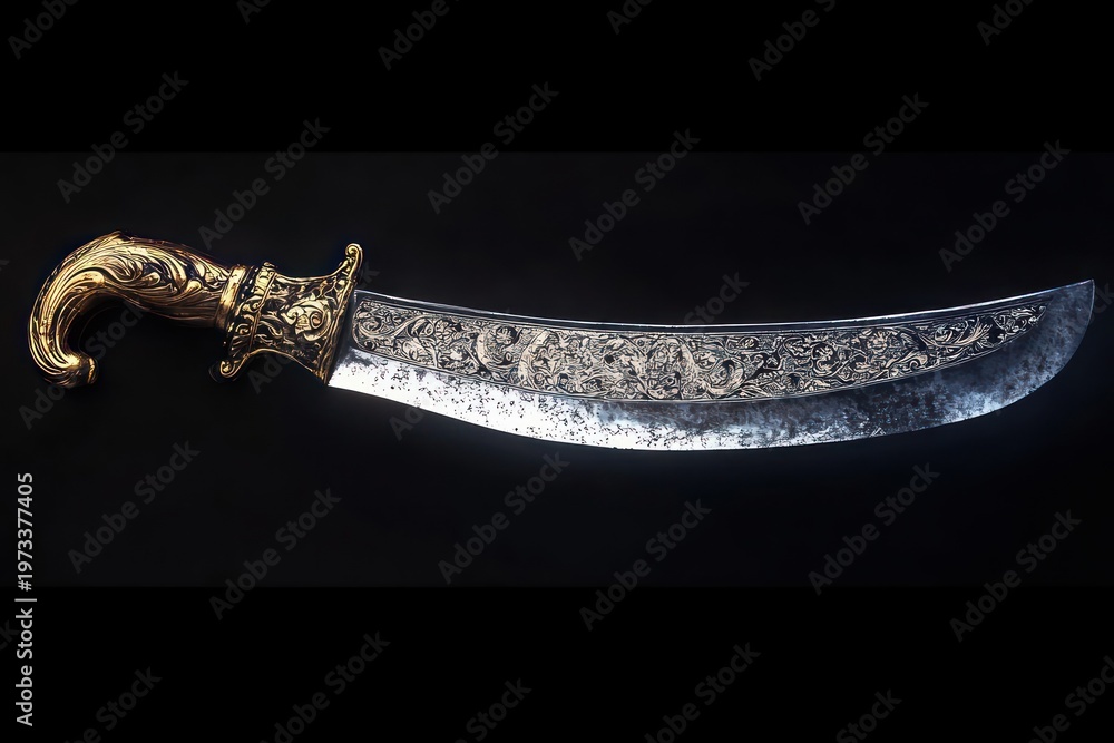 ornate curved sword with gold hilt and intricately engraved steel blade on black background, evoking elegance and quiet menace #1973377405