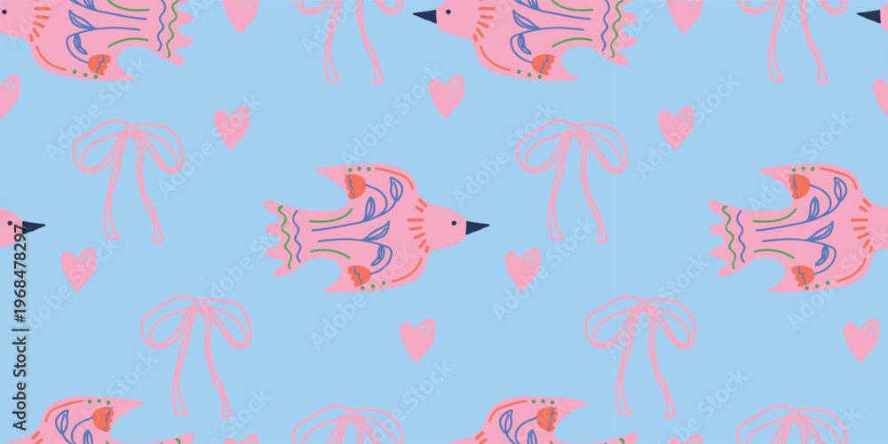 Ornate folk birds with floral wings and hearts pattern on pastel blue for bohemian nursery decor #1968478297