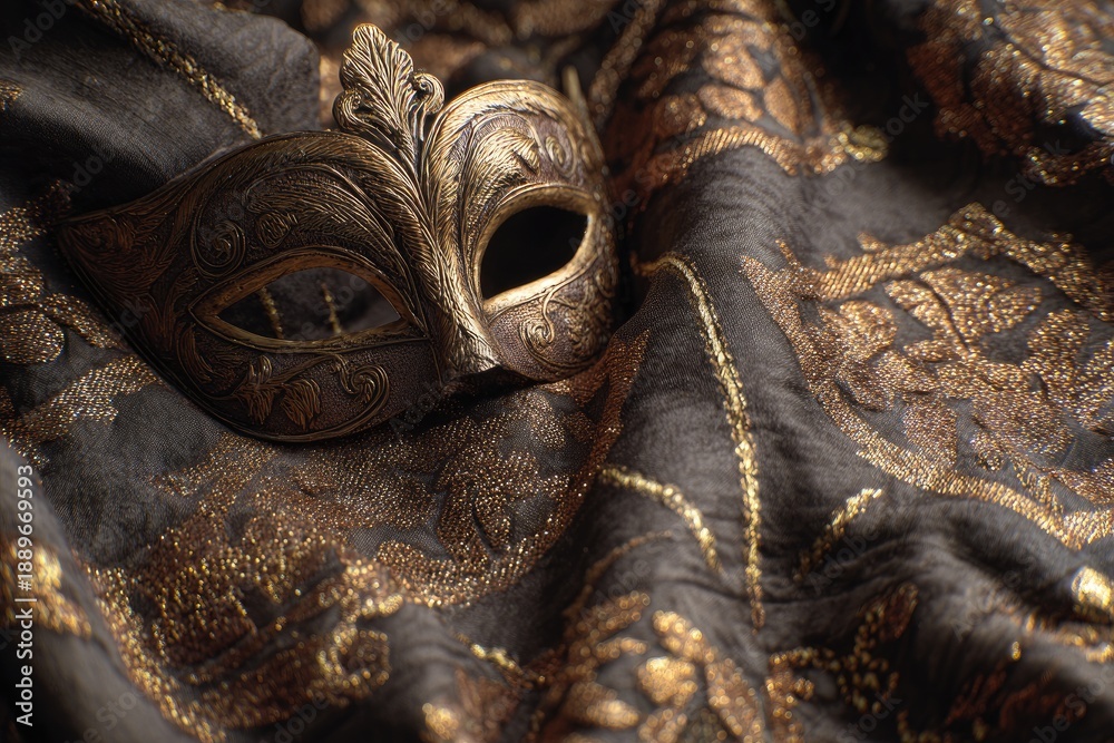 Ornate golden masquerade mask rests on rich, textured fabric with intricate patterns #1889669593