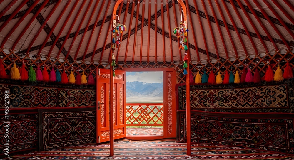 Ornate interior of a traditional Kyrgyz yurt featuring vibrant textiles and tassels with a scenic view of distant mountains. #1935121186
