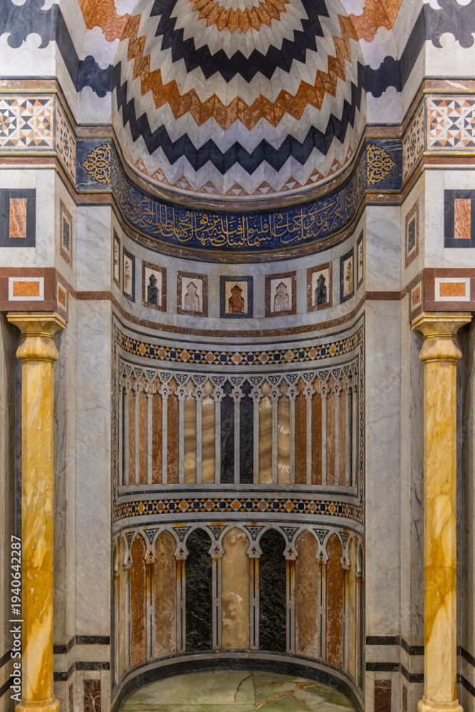 Ornate Islamic mihrab and mosque interior with marble inlay in Cairo, Egypt, traditional architecture #1940642287