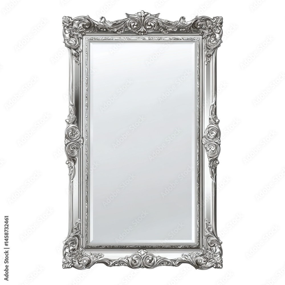 Ornate silver mirror with intricate floral and scrollwork frame, elegant vintage style decor reflecting light beautifully #1458732461