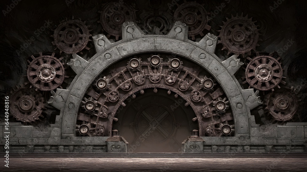 Ornate stone archway adorned with intricate, rusted gears. #1644948816