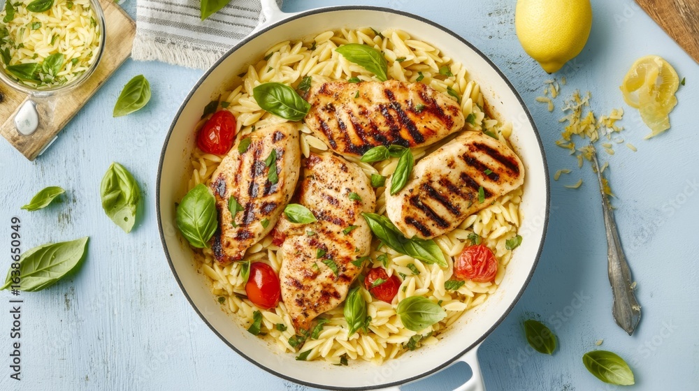 Orzo with golden grilled chicken in a white skillet, topped with basil and lemon zest. Light blue background adds freshness. #1638650949