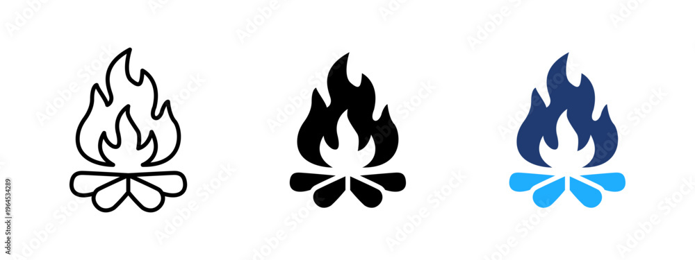 Outdoor campfire icon. Burning flame and wood fire symbol. Blaze, heat and smoke sign. Camping and nature hearth concept representing warm outdoor campfire and fire. #1964534289