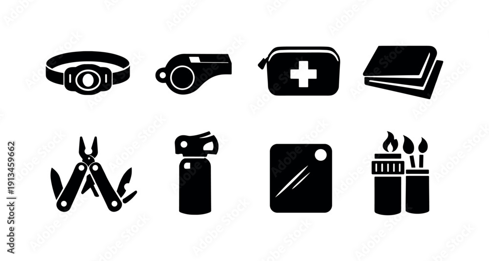 Outdoor camping safety items: headlamp, whistle, first aid pouch, emergency blanket, multi tool, bear spray canister, signal mirror, waterproof match case. #1913459662