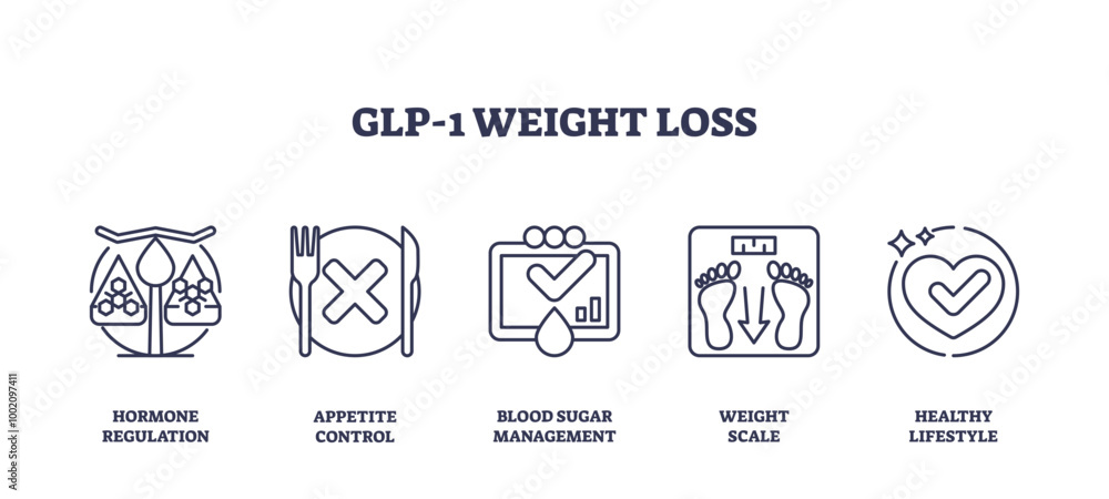 Outline icons set depicting hormone regulation, appetite control, blood sugar management, weight scale, and healthy lifestyle, preferably at the end of the sentence, transparent background. #1002097411
