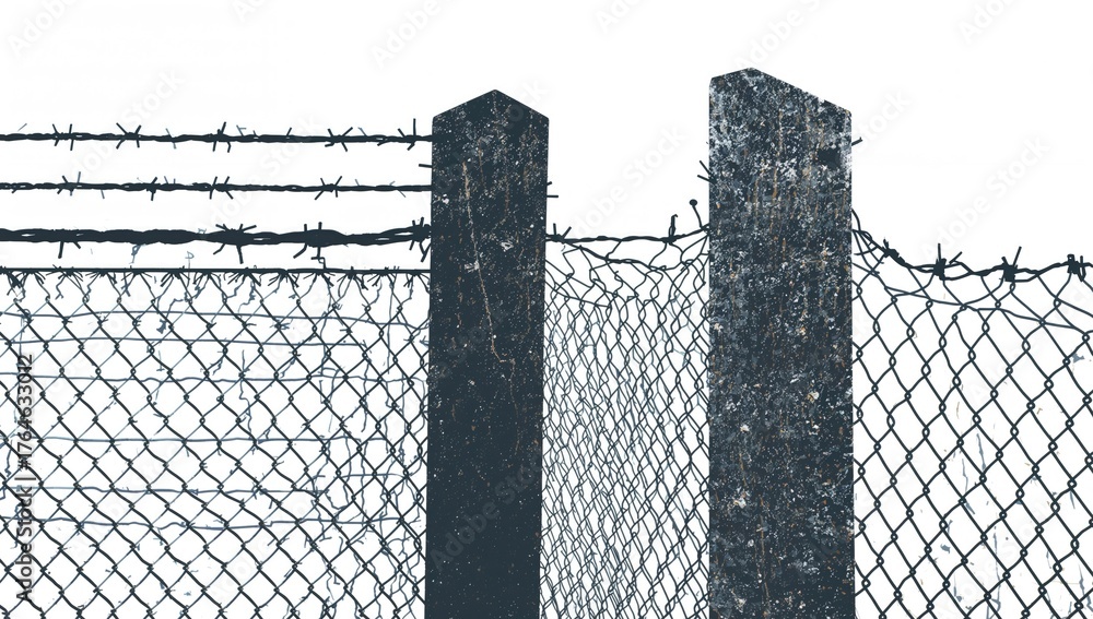 Outline of a Wire Mesh Barrier with Sharp Wire and a Concrete Post against a Light Backdrop #1764633012