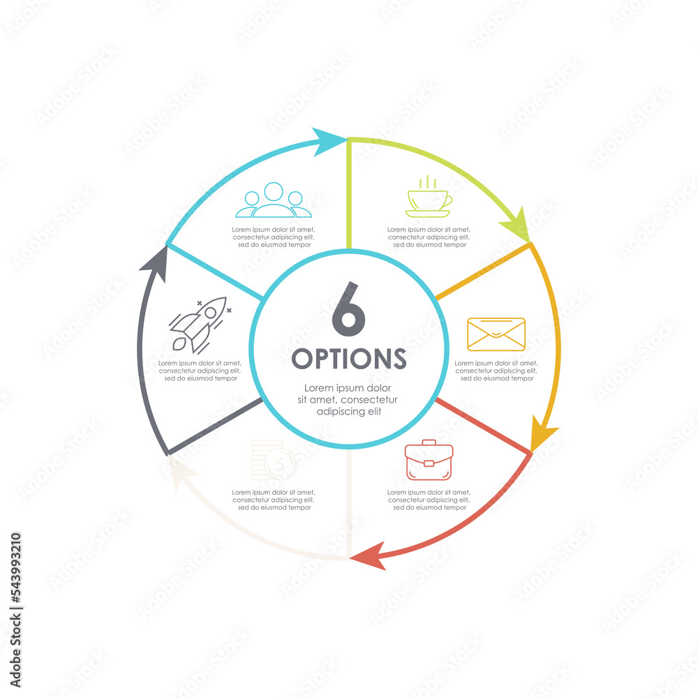 Outline round infographic element. Circle template 6 steps with arrows. Vector illustration #543993210