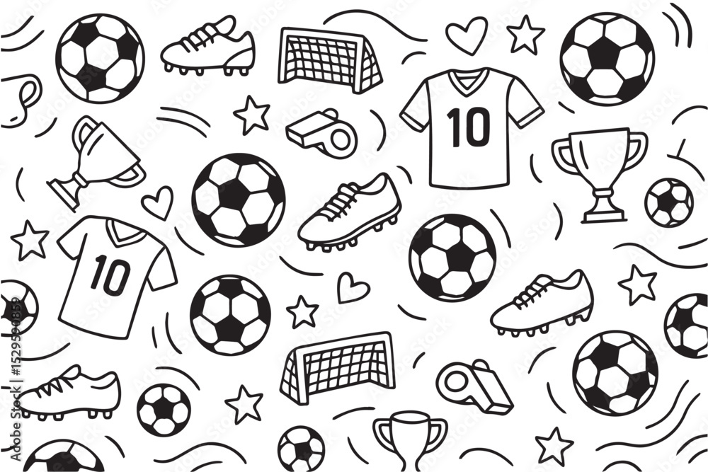 Outlined vector background in black and white, filled with soccer themed elements like balls and goals, drawn in bold lines and simple forms. #1529590859