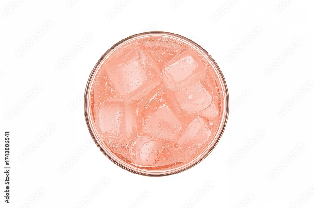 Overhead perspective of a pink soda beverage with ice cubes in a glass, isolated on a white backdrop with clipping path. #1743806541