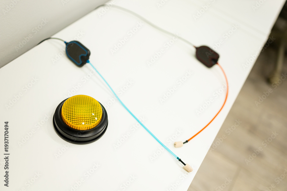 Overhead photograph of a game used to assess children's hearing in a medical clinic. Interactive button with a television in the background. #1937170494