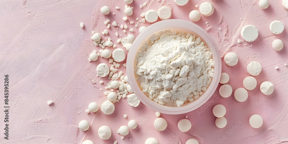 Overhead shot of collagen or protein powder on pastel background for health and wellness. Concept Health and Wellness, Collagen Supplements, Pastel Background, Overhead Photography #845395286
