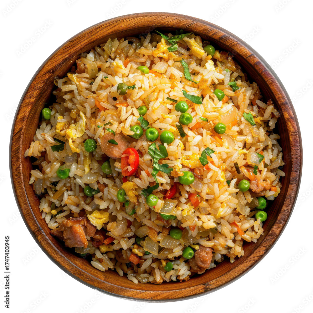 Overhead view of savory fried rice with peas, egg, and meat in wooden bowl, isolated on white background #1747403945