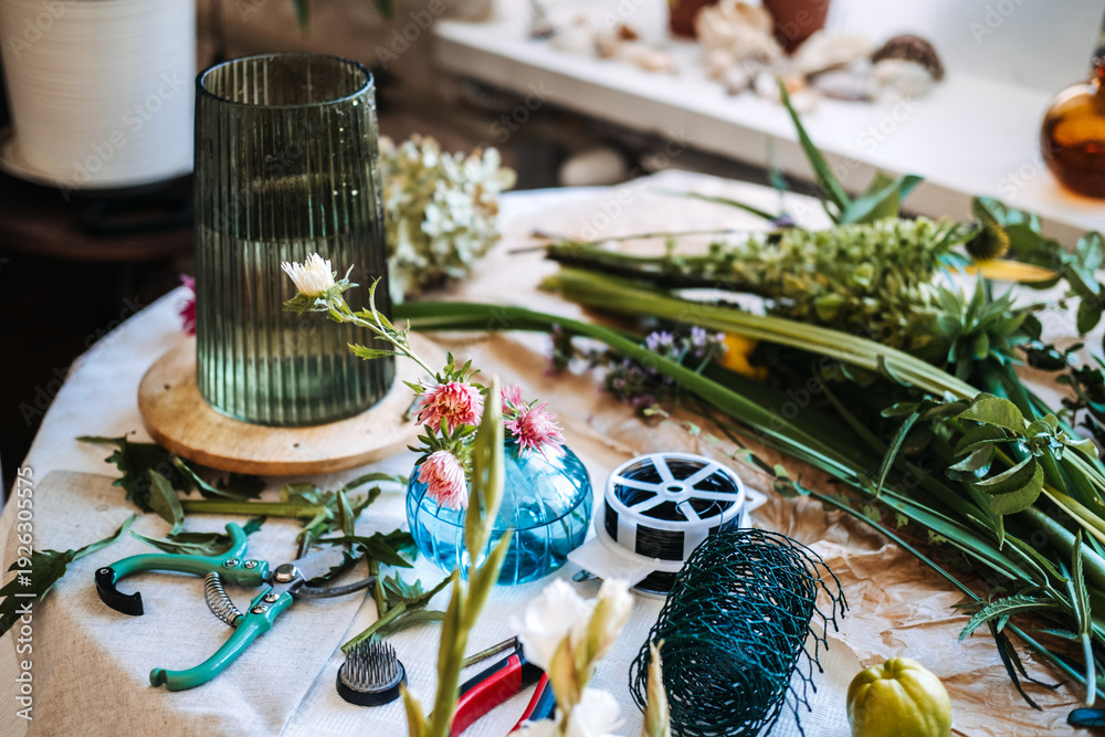 Overhead view shows smartphone on table surrounded by florist tools and botanical stems for flower arranging. Floral masterclass, botanical education, creative flower arranging course. #1926305575