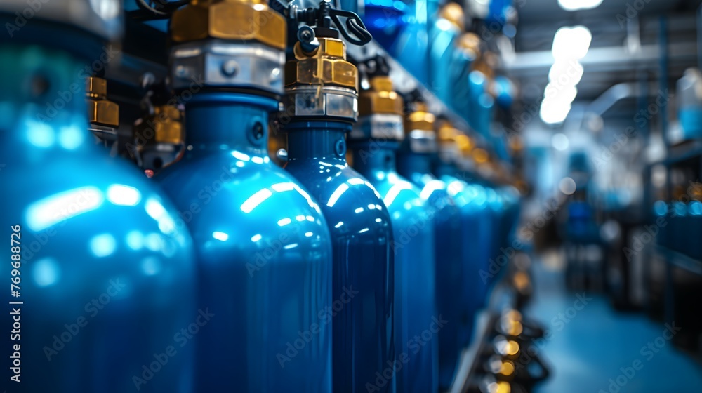 Oxygen cylinder with compressed gas. Blue Oxygen tanks for industry. Factory #769688726