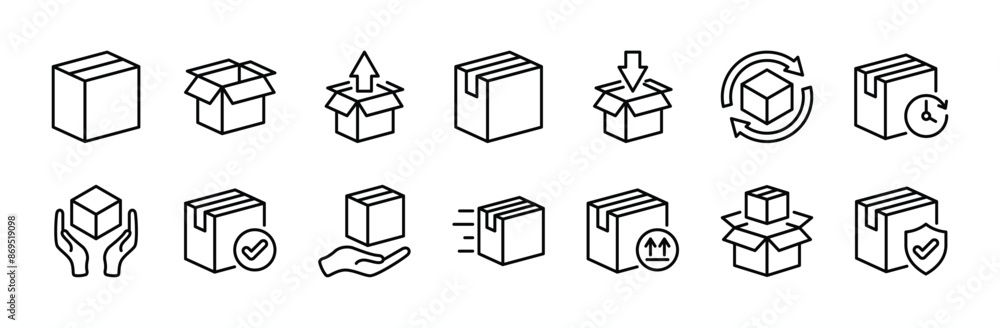 Package box line icon vector set. Containing open cardboard, fast delivery box, container, parcel protection, storage, good packing, fragile, wrapped, offer, processed, product shipping, merchandise #869519098