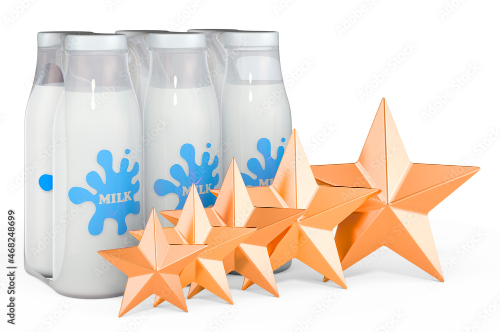 Package of glass milk bottles in shrink film with five golden stars. Customer rating of milk. 3D rendering #468248699