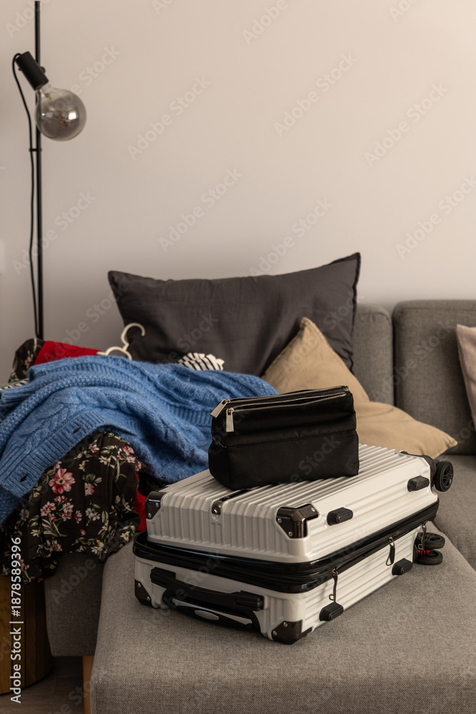 Packed suitcase with toiletry bag and clothes on sofa in modern living room #1878589396