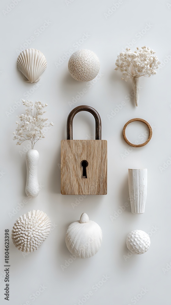 Padlock and white textured objects: security and natural decor #1804623398