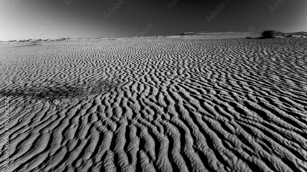 Paesaggi in bianco e nero. viste del deserto con dune e vegetazione tipica nella provincia di Tezeur, Tunisia. Nord Africa #1907982242