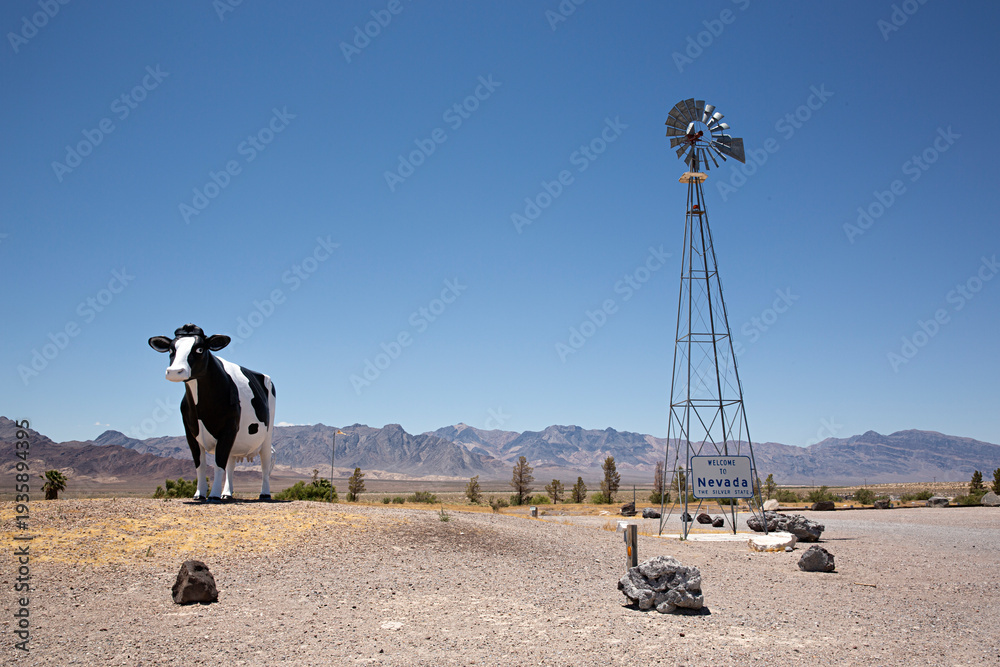 Paisaje de entrada a Nevada con escultura de vaca. Estados Unidos. #1935894395