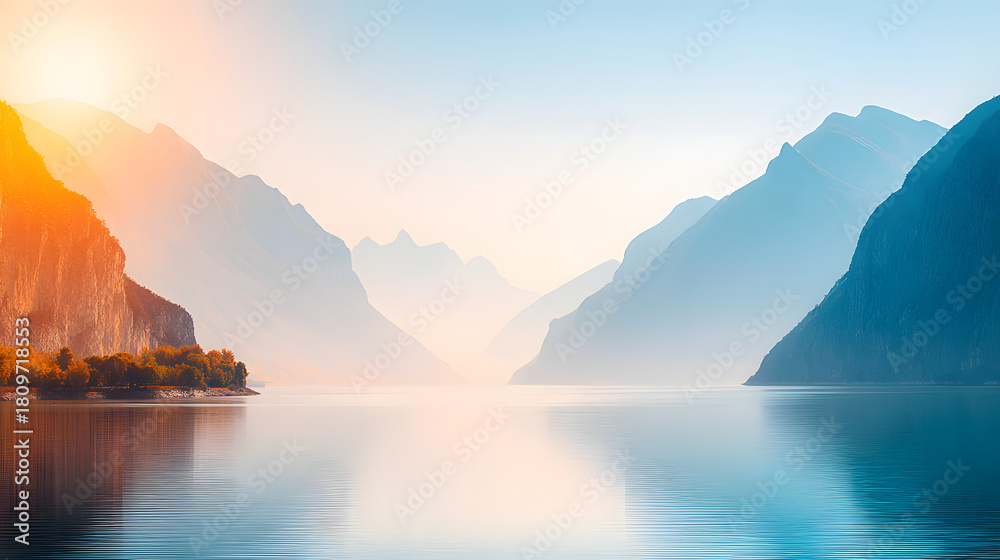 Paisaje montañoso iluminado por rayos de sol sobre lago tranquilo al amanecer #1809718553