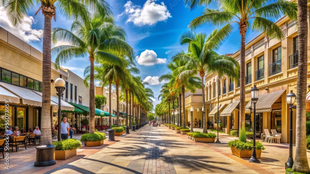 Palm trees line a pedestrian walkway along a bustling outdoor shopping center with upscale storefronts and restaurants on a sunny day in South Florida. #955073959